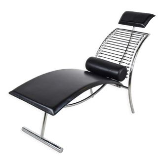 Vintage 'chaise longue' made from a elegant black metal frame, elastic cords and black leather cushions. Rare and beautiful lounge chair very much in the manner of rene herbst 'sandow' chairs. The chair has beautiful curves and has a timeless appeal. Very good condition. 1990s - italy. Dimensions: Height: 86cm/33.85" Width: 140cm/55.11" Depth: 53cm/20.86" Seat height: 44cm/17.32" Ref.: 165243.