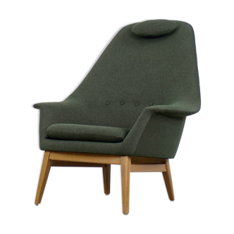 Reupholstered danish mid-century modern reclining chair designed by henry w. Klein. The chair has a rounded design with a subtle wing back and has a reclining mechanism adjusted with a knob on the right-hand side of the base. The base is made of teak wood. The chair has been professionally reupholstered.