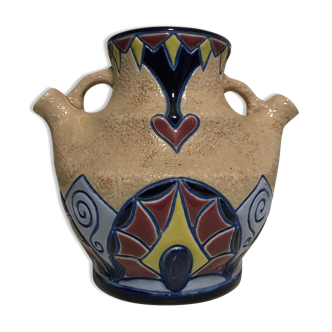 This is a ceramic vase on a metal base, signed Alba H Ennex.