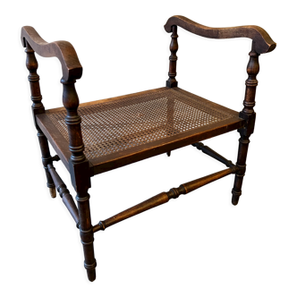 Originally designed as a piano bench, this small vintage seat embodies the functional elegance of the Napoléon III style. Intended to accompany music and the bourgeois interiors of the 19th century, it combines balanced proportions, comfort, and discreet refinement. The beautifully patinated wooden structure is complemented by a caned seat that adds lightness and breathability to the whole. It evokes plush salons, open sheet music, and interiors where art occupies a central place. Today, this bench naturally finds its place in an entrance, at the foot of a bed, in a living room, or of course in front of a piano, where it returns to its original purpose while becoming a true decorative element. Dimensions: L 68 X H 71 X D 35.5 cm – Seat height 40.5 cm.