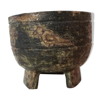 Old decorated copper pot cover with handle. Marks of time, a charming patina. Dimensions: height 14 cm; diameter with handle: 21 cm. Pot diameter: 17.5 cm.