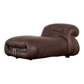 Pair of brown leather and metal armchairs designed by Afra & Tobia Scarpa. Model: Soriana. Stamped Cassina. Seat height: 40 cm. Wear due to time and age.