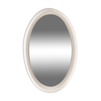 Typical oval mirror from the 70s with a white plastic structure. Several hooks on the backs. Good condition. Vintage style.