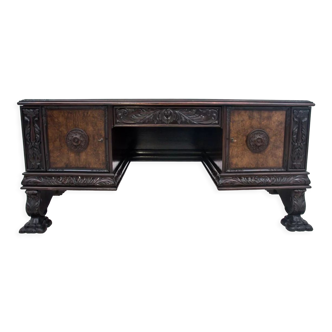 Finding an authentic 1930s Art Deco piece with proportions suitable for a modern TV or audio setup is incredibly rare. We are proud to present this unique, low-profile stepped sideboard, perfectly blending historical elegance with contemporary functionality. **Design and Material** This piece represents the Streamline Moderne aesthetic, featuring a horizontal, stepped silhouette with softly rounded edges and beautifully curved drawer fronts. The absolute highlight of this furniture is the spectacular blonde burl veneer (likely birch or ash). The master cabinetmaker arranged the veneer to create mesmerizing, symmetrical, and kaleidoscopic patterns on the doors and top. Its warm, golden-honey tone brings light and a jewellery-like elegance to any interior, standing out from the typical dark walnut pieces of the era. **Functionality** Thanks to its unique stepped dimensions, it serves as the ultimate media console. The lower central section (46 cm high) is perfect for a soundbar or media receiver, featuring an open shelf and two charming drawers above it. The slightly higher side cabinets (55 cm high) provide an excellent base for a large flat-screen TV, a vintage record player, or decorative lamps. The depth of only 36 cm means it will not overwhelm your living space or block pathways. **Restoration and Condition** The piece has been completely and professionally restored in our specialised workshop. It was carefully disassembled, and old yellowed varnishes were removed down to the bare wood. The surface was then finished with premium hard wax oil. This treatment provides a natural, satin-matte finish that is silky to the touch and highly resistant to water, stains, and daily wear, unlike old glossy lacquers. The interior is flawlessly clean, odourless, and ready for immediate use. **Dimensions: ** Total width: 133 cm. Depth: 36 cm. Height of the side cabinets: 55 cm. Height of the middle section: 46 cm. Style: Art Deco, Streamline Moderne. Period: 1930s. Origin: Central Europe. Condition: Rest.