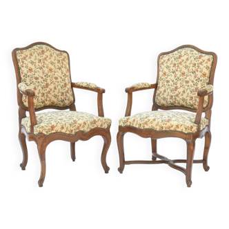 Pair of louis XIV period molded and carved walnut armchairs. Resting on four turned wooden legs connected by an h-shaped spacer. 17th century total height 102 cm seat height 41 cm seat depth 52 cm width at armrests 62 cm.