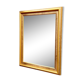Large old louis philippe mirror dating from the late 19th century. The frame has been internally repatinated to restore it to its original shine. Some traces of time are visible on the frame, the ice is pricked and has some scratches in some places. Original complete parquet floor on the back. Height: 147 cm. Width: 87 cm.