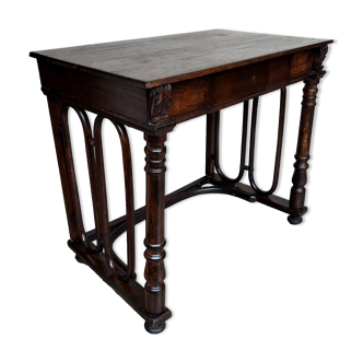 You would almost expect to hear, coming out of his drawer, a sweet melody... Its two feet in the shape of a lyre, its graceful silhouette are certainly for something: nice drawer, empire style. On its pedestal, a vacuum pocket; two brass buttons allow access to the drawer. Mahogany-type wood, varnished. This old little pedestal, is in good condition. It will also please at the bedside, end of sofa...