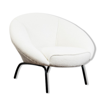 Ball armchair via della spiga. Chromed aluminum foot and egg-shaped seat, with padded seat cushion. Upholstery in white tinted imitation leather. Swivel chair. Very comfortable. Seat height 40cm. Perfect for all your waiting areas, reception or home.