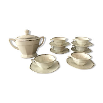 French coffee set in Limoges porcelain. Consisting of a coffee pot and 8 art deco coffee cups, accompanied by a teapot. đ Coffee pot. 24 cm high. 26 cm wide with spout and handle. 8 cups. 7 cm in diameter. 6 cm high. Teapot. 12 cm in diameter. 20 cm wide with spout and handle. 13 cm high.