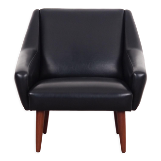 Original vintage living room armchair dating from the 1960s. Beech base, brass shoes present. black skai tapestry with square stitching by Erton. Traces of use due to time. Beautiful piece