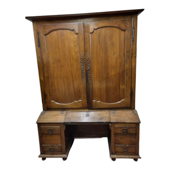 Asymmetrical art deco wardrobe with different storage spaces: drawers, locker, shelves and wardrobe. The cabinet has been completely sanded. There are 5 shelves in total (only 2 shown in the photo). A vintage cabinet that retains all its patina of time. Dimensions: height 167 cm, width 100 cm and depth 45 cm.