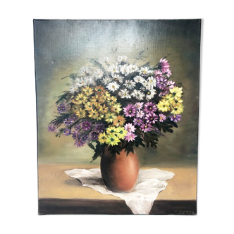 Old still life on panel and its wide frame (damaged) Bouquet of blue flowers signed pony.