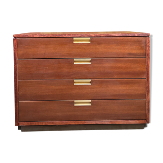 Meuble à chaussures vintage année 50. Élégant meuble à chaussures aux faux airs de commode, 2 tiroirs (coulissent parfaitement), 3 couvercles inclinés en cascade s'ouvrant sur de grands compartiments. Poignées fines en laiton. Quelques traces de temps.