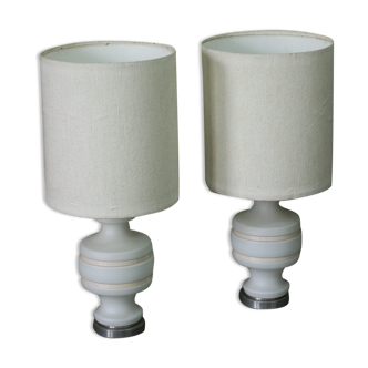 Pair of scandinavian table lamps in the taste of gunnar ander lindshammar. The foot is made of blood orange ceramic accompanied by a new lampshade. They are in very good condition. Size: Diameter: 8cm. Height without lampshade: 15 cm. Height with lampshade: 29 cm. Delivery possible or hand delivery in nantes. Tags: bedside desk table lamp on foot vintage danish design scandinavian 50s 60 70 80 designer.