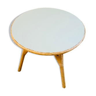 Small round coffee table from the 60s in wood and rattan, in the style of janine abraham's creations. We love the detail of the rattan on the sides of the tray which gives a pretty graphic design to the whole. The top was repainted pink and protected with a colorless wax. Good general condition, be careful the tray is slightly higher on one side than the other. - total dimensions - diameter 68 X h 50/51 cm.