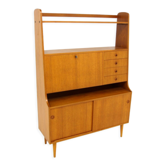 The RY20 highboard, designed by Hans J. Wegner in the early 1950s for Ry Møbler, is a refined example of Danish modern storage design. The upper cabinet is fitted with sliding doors that open to reveal adjustable shelving, while the lower section is composed of six well-proportioned drawers, offering generous and practical storage. Made from a combination of solid and veneered teak, the piece highlights the richness of the wood, with its warm tones and expressive grain. The overall design reflects Wegner’s understated approach, where craftsmanship, clarity of form, and everyday functionality are brought into quiet balance. Neat condition with age-related signs of use.