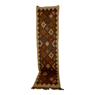 Traditional red and multicolored patterned afghan hallway kilim rug. Our colorful kilims afghans rugs are the result of a long and exceptional work of afghan weavers. Wool from ghazni was spun by hand and then colored from plants for an exceptional color palette. The weavers of the maimana region in northern afghanistan then produce real works while perpetuating ancestral know-how known throughout the world. Our colorful afghan kilims, characterized by traditional geometric patterns, are endowed with a very beautiful and rich color palette that will brighten up your interior. Of exceptional quality, maimana kilims are woven in such a way that they are extremely robust and durable to be passed down from generation to generation. Thanks to their flat weave and their resistance, they are very easy to maintain, so you can slide them anywhere in the house (hallway, entrance, dining room, bedroom, living room ect...). Bonus point: they are reversible! Matter: 100% sheep's wool. Handcrafted in afghanistan. Size: Length: 288 cm. Width: 82 cm. Height: 0.5 cm. Other dimensions: 288 X 82 cm.