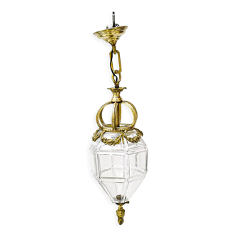 Opaque engraved glass pendant, brass hook with chain globe height 20 cm, max diameter 16 cm, total height 55 cm, traces of use and small chip on the edge, see photo.