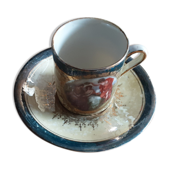 At the end of the 19th century, the Digoin Sarreguemines factory produced a collection of semi-porcelain with Chinese "brown gold" decoration. The cup shows a character playing the Chinese zither and the saucer shows a couple in the middle of a garden. Note that the decoration of the cup is very slightly faded and the presence of a hair on the cup, the whole remains in good condition considering its age. 📐 cup diameter 11cm. Cup height 7cm. Saucer diameter 18.5cm. Weight of the whole 0.400g.