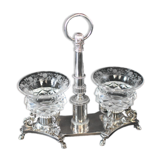 1 aperitif server composed of a silver-colored metal display and two glass bowls old object age-related traces of use height 18cm width 22cm depth 11cm.