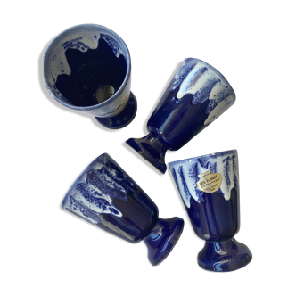 Set of 5 cups in cobalt blue enamelled sandstone and white drip on the top that bring a lot of charm to each element - flamed gres. They are all signed below "petit massé" In very good vintage condition! Dimensions: height 11 cm, top diameter 7 cm, bottom diameter 5.5 cm, depth 8 cm, weight 750 g.