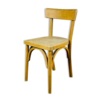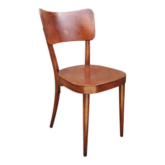 Old bistro chair in wood and red skaï (dated 04/59). Beautiful conservation, stable, skates present, marking unknown.