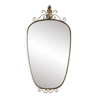 Period: ca. 1960. The mirror has a classic rounded rectangular shape and is framed by a simple strip of gold-colored metal. It is decorated with metal buckles at the top and bottom and a single sheet of acanthus at the top. There is a rear suspension hook. The wall lamp console has a mirror glass shelf. It is decorated with metal zigzags underneath. The console foot is formed by a double metal loop. There are two hooks on the back. Although the stamp on the back of the mirror is unreadable, its parts are certainly manufactured by deknudt, a belgian company that began producing design mirrors in 1947 renowned for their superior quality. State: Very good. No damage. Mirrors in excellent condition. Sheets and metal parts have oxidation marks as one would expect on an item of this age. See the photos for more details. The metal frame strip around the console moves a little but this will not be the case once attached to a wall.