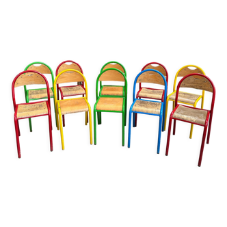 Suite of 4 4 metal chairs seated in teak, good condition, beautiful patina. Ht seat 47.