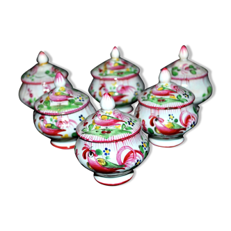 Covered pot or candy in moustiers earthenware, handmade, with rotating decoration of bird and character.