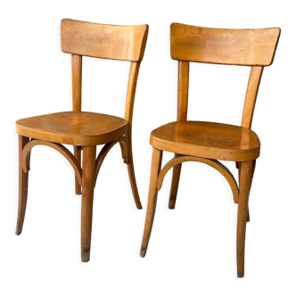 Set of 4 beech bistro chairs, varnished in a honey color, in very good condition. They benefit from a period patina. They are very solid and stable. Seat height 47cm.