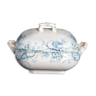 Magnificent square vegetable dish (or tureen) in iron clay from the bfk factory (boch brothers keramis), "daisy" model. A crack is present below/inside the vegetable bowl. Despite good cleaning, a stain persists inside the receptacle. Stunning floral designs in a very soft light blue shade. The handles, also decorated with patterns, are in perfect condition for a good grip without burning. Full of charm, this vegetable dish will look great, both as decoration and on a pretty table. Height: 13 cm. Width: 26 cm. Depth: 19 cm. P 1,250 kg.