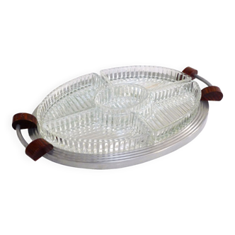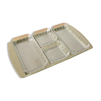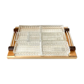 ✨️Art Deco mirrored tray. ✨️Combining practicality and aesthetics, this pretty mirrored tray with its four rectangular molded glass compartments allows you to elegantly serve small cakes during: ✨️Appetizers. Dimensions: 36 cm x 16.5 cm. Height: 4 cm. Weight: 1.485 kg.
