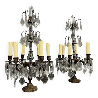 Pair of four-light brass candelabra candlesticks with glass pendants and a so-called "dagger" tip, electrified.