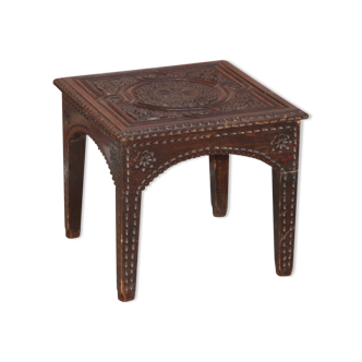 Vintage hexagonal side table in solid oak in Moroccan style. Generally in good condition, stable and sturdy. Note some signs of wear and woodworm holes at the feet that have been treated (see photos). Dimensions: Height: 51.5 cm. Length: 58.5 cm. Depth: 51 cm.