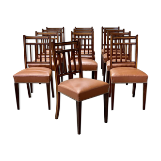 Set of 10 dining room chairs of light wood and upholstered with cognac leather from the 1940s. The chairs are in great vintage condition. H - 85 cm, w - 45 cm, d - 43 cm and sh - 45 cm.