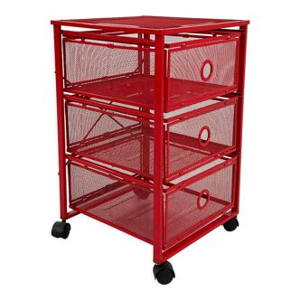 Antique 1980s USM Haller cabinet, consisting of two rows of three drawers each. The base structure is covered with black modules; the two top drawers are beige, and three drawers (which can be installed as desired) are red and one is black. The entire unit rests on four casters, making this cabinet easily movable. The unit is very sturdy, like all USM units. Patina of use and marks in places on the colored metal plates are inherent to its age; please refer to the numerous photos. The unit, with all its drawers, is very heavy. - Overall dimensions - W 81 x D 52 x H 99 cm Dimensions of small drawers - W 34 x D 49 x H 14 cm Dimensions of large drawers - W 34 x D 49 x H 30 cm