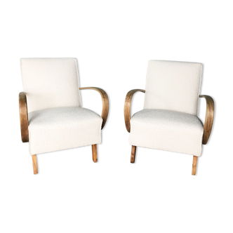 Pair of art deco armchairs, so-called "mustache", renovated. The blond wood is varnished matte wax finish. On the front and sides, the fabric is a linen color, woven. With a golden yellow straw thread. The backrest is coated with a yellow fabric, fabrics with which the front hair pass was made. The back piping is made with linen-coloured fabric. The seat height is 34cm, and the base depth is 50cm.