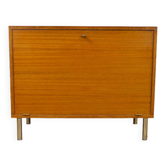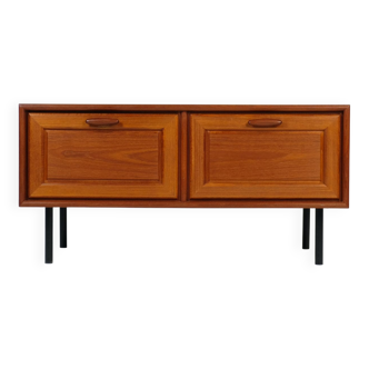 Danish modern chest of drawers. Teak wood. Beautiful minimalist door handles. The drawers front is made of 1 piece solid teak wood.the door handles is milled inside. Great condition. With neew hairpin legs.