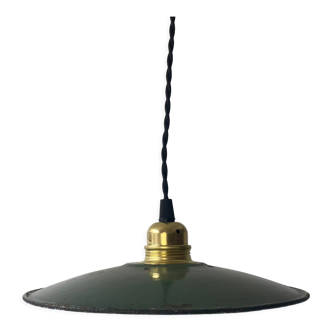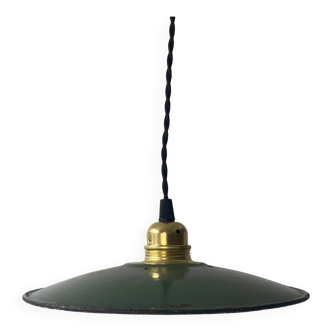 Pair of suspensions from the 1960s. Enamelled sheet metal reflectors (one side white and one side black with gold edging), brass e27 sockets (provide two bulbs with large 60 watt screw base), brass cable ties, gilded twisted electric cable, porcelain pavilions and hanging rings. To be reported on one of the two reflectors: a trace of glue on the black side and a burst of enamel on the edge (see photos).