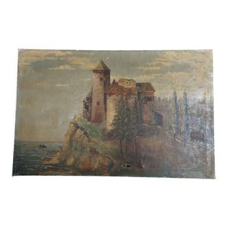 Tableau: gouache on cardboard depicting a lakeside landscape with mountains in the background. It is dated and signed at the bottom right. It is in good condition except for some wear in the bottom right corner.