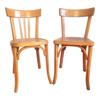 This trio of vintage seats reflects the charm of French café furniture from the 20th century. They are stamped underneath "Baumann". A manufacturer established in 1901 in Colombier-Fontaine, Doubs, by Émile Baumann, a Swiss passionate about woodworking. This visionary entrepreneur aimed to democratise quality furniture at a time when furniture was either very expensive or of poor quality. Baumann offered elegant, sturdy, and accessible seating. Steam-bent wood became the company's specialty. This revolutionary method allows for the creation of smooth, natural curves without weakening the wood's structure. In fact, this is exactly what gives Baumann chairs their recognisable silhouette, with clean lines and organic shapes. Over the decades, the manufacturer developed a whole range of models, each with its own personality. This model clearly showcases the use of the traditional bent wood technique, as well as the small curved backs that conform to the shape of the back, ensuring optimal comfort. Its natural patinated wood finish adds warmth and character to any space. Solid and comfortable, these chairs can be used in a kitchen, dining room, café, bar, or brasserie. Items sold as they are, with visible signs of wear in the photos.