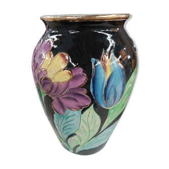 Vintage vase signed Vallauris, two different sides: one with roses, the other with peonies. The gold plating has slightly tarnished over time. Height 22cm. Width 20cm.