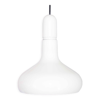 Very nice suspension around 1970. Diffuser in opaline glass tinted in the mass of white color in shape called "drop of water". Relatively large, opaline is 26.5 cm high and 24.5 cm in diameter. White plastic ceiling lamp 6.5 cm high and 7 cm in diameter. Luminaire adjustable in height by the wire up to 90 cm. In perfect condition (electric wire changed, neither crack nor shine), this very nice suspension, very refined, will bring a zen vintage touch to your interior for example in an entrance hall by diffusing a very soft light.