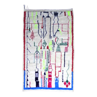 Transform your space with this vibrant Moroccan rug, a handcrafted wool piece that embodies the color, symbolism, and heritage of Moroccan artisan traditions. With its warm ochre base and colorful tribal patterns, this rug is a unique work of functional art, serving as both a focal point and a versatile decorative element in your home. Woven by skilled artisans in the Atlas Mountains, this rug reflects the craftsmanship of generations. Every detail, from geometric shapes to playful patterns, tells a story, inspired by Berber symbolism and Moroccan cultural heritage. The result is a piece that is not only stunning but also rich in meaning. The dominant ochre yellow background radiates warmth, creating a welcoming element in any room. This golden hue instantly brightens the space while creating a natural, solid foundation for the rest of the design. The surface is adorned with scattered patterns in shades of red, deep blue, lavender, powder pink, and soft gray, creating a lively and dynamic composition that draws the eye without being overwhelming. At the center of the rug is a large diamond pattern in overlapping hues of red, lavender, and blue, a symbol of protection and harmony in Berber culture. Around it, smaller motifs tell their own stories: ladder-like shapes, architectural forms, and abstract arrangements that can evoke village gates, looms, or even stylized animals. These symbols not only provide visual interest but also connect the piece to centuries-old storytelling traditions through weaving. Along the edges of the rug, vertical panels of red, powder pink, and gray create a frame effect, reinforcing the composition's balance.