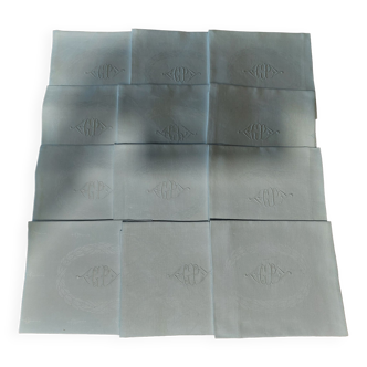 Beautiful set of 12 old napkins md monogram embroidered old table art very chic good condition small yellow marks in places but not stained not with holes dimensions 73 cm X 69 cm.