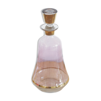 Old carafe without its cap. To be used as a vase. 50s or 60s. Pink glazed blown glass with spiral golden edging. Good condition, there are small gaps in the pink enamel and in the gilding in some places. Take the time to look at the photos, everything is shown! Height 19 cm, diameter at widest 9.5 cm.
