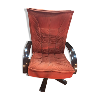 Pair of tubular armchairs in swivel chrome steel. Both seats are in good condition. A button is missing from a folder but, possibility to recover one at the back of the folder. The fabric is a bit past but original. (there are new products to tighten the fabric) Seat height 45 cms. Seat depth 50 cms. Seat width 65 cms.