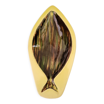 A pretty ceramic cup in the shape of a fish. Yellow and black. Hand painted. Numbered. A pretty kitchen decoration from the 60s and 70s. Can also be used as a butter maker or empty pocket! Length: 24cm.