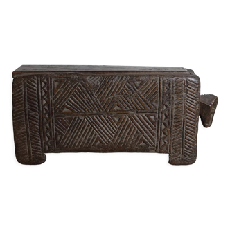 Carved ebene wood box. Remarkable work of the craftsman who made it from a single piece of ebene wood because there is no assembly. The geometric mofifs in relief give it all its modernity. The plus: its authentic 'brutalist' style side!.