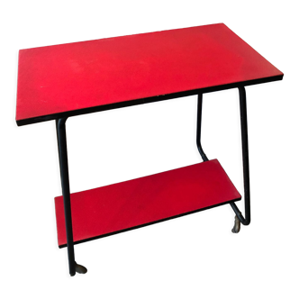 Red side table in skaï, formica and metal and casters, rn good condition. Height 76 cm, width 63 cm, depth 53 cm.